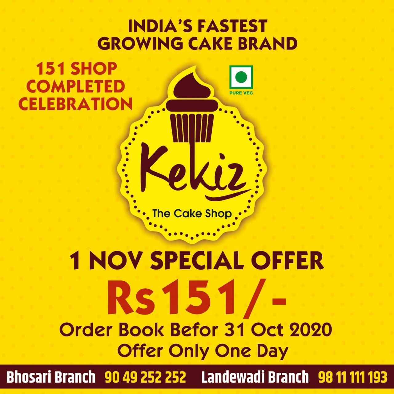 पिंपरी चिंचवड : केकीज केक शॉप च्या पुणे,पिंपरी चिंचवड व जिल्ह्यात १५१ शाखा पूर्ण झाल्याने आपल्या खवय्ये ग्राहकांसाठो १ नोव्हेंबर रोजी १५१ रुपयात केक अशी ऑफर सुरु केली आहे. ही ऑफर एक दिवस चालू राहणार आहे. आकर्षक डिझाईन, कस्टमाईझ केक,योग्य किंमत आणि उत्तम दर्जा यांमुळे अल्पावधीतच केकीज ने सर्वांच्या मनात घर केले आहे. कमी कालावधीत एका शाखेवरून वरून दीडशेच्या वर शाखांपर्यंत मजल त्यांनी मारली आहे.