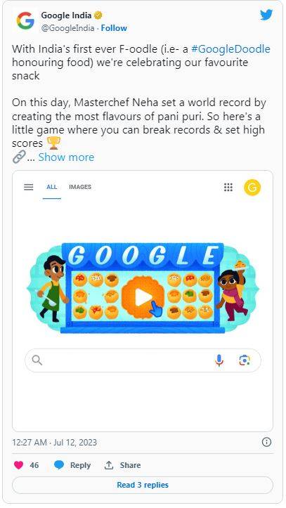 गुगलने गोलगप्पा म्हणजेच पाणीपुरीच्या विश्वविक्रमाचीही माहिती दिली आहे. गुगलच्या म्हणण्यानुसार, २०१५ मध्ये, मध्य प्रदेशातील इंदौरमध्ये असलेल्या एका रेस्टॉरंटच्या नावे पाणीपुरीच्या वेगवेगळ्या चवीच्या पाण्याचा जागतिक विक्रम नोंदवला गेला आहे. पाणीपुरी सर्व्ह करताना, इंदूरमधील रेस्टॉरंटने विविध फ्लेवरच्या पाण्याचे ५१ पर्याय ठेवले होते.