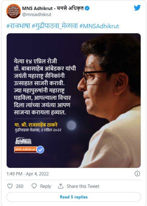 आव्हाड यांच्या या विधानानंतर आता मनसेच्या अधिकृत ट्विटर हँडलवरुन एक पोस्ट करण्यात आली आहे. त्यामध्ये, राज ठाकरेंच्या गुढी पाडव्याच्या भाषणाचा उल्लेख करण्यात आला असून १४ एप्रिल रोजीची डॉ. बाबासाहेब आंबेडकर यांची जयंती उत्साहात साजरी करा, असे आवाहन राज यांनी केल्याचे सांगितले आहे. तसेच, ज्या महापुरुषांनी महाराष्ट्र घडवला, आपल्याला विचार दिला, त्यांच्या जयंत्या आपण साजऱ्या करायला हव्यात, असे राज यांनी म्हटले आहे.