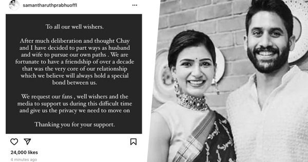 समांथाने तिच्या इन्स्टाग्राम अकाऊंटवरून ही पोस्ट शेअर केली आहे. या पोस्टमध्ये “आमच्या सगळ्या हितचिंतकांसाठी, बराच विचार केल्यानंतर मी आणि चै(नागा चैतन्य)ने पती-पत्नीच्या नात्यातून बाहेर पडण्याचा निर्णय घेतला आहे. गेल्या १० वर्षांपासून आम्ही खूप चांगले मित्र-मैत्रिण आहोत आणि आमच्यात असलेल हे नात कायम राहिलं. आम्ही आमच्या चाहत्यांना आणि माध्यमांना विनंती करतो की या कठीण काळात ते आम्हाला पाठिंबा देतील आणि आम्हाला प्रायव्हसी द्याल. तुम्ही दिलेल्या पाठिंब्यासाठी धन्यवाद,” अशा आशयाची पोस्ट समांथाने केली आहे. समांथाची ही पोस्ट सोशल मीडियावर प्रचंड व्हायरल झाली आहे.